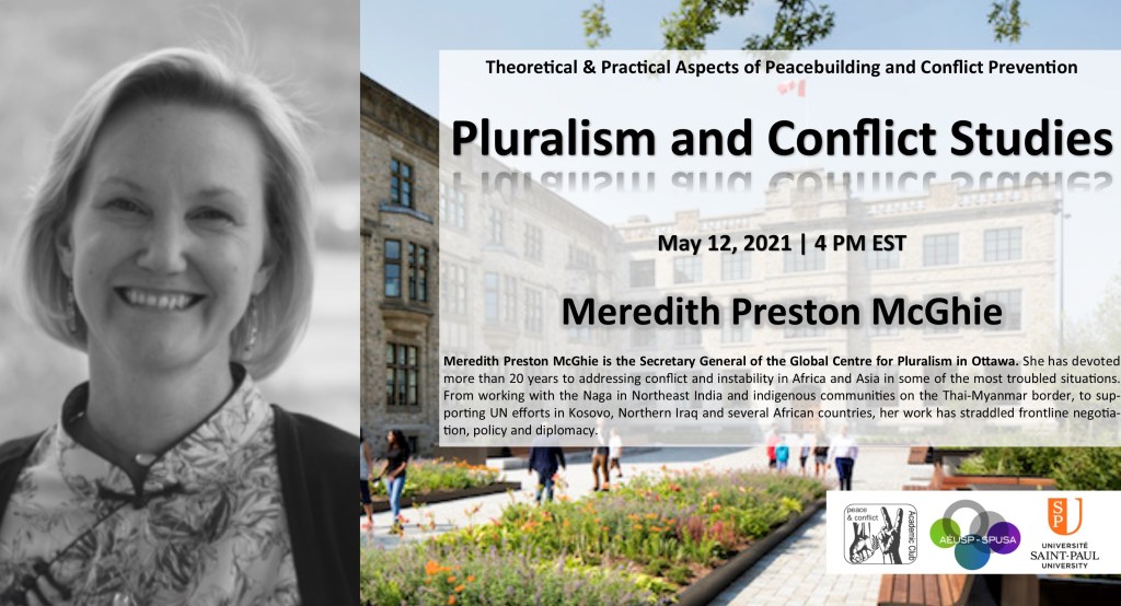 Saint Paul University Student Association (SPUSA) and Academic Club for Peace-Conflict Studies (ACPCS) are pleased to host Ms. Meredith Preston McGhie at the monthly seminar on Theoretical & Practical Aspects of Peacebuilding and Conflict Prevention: