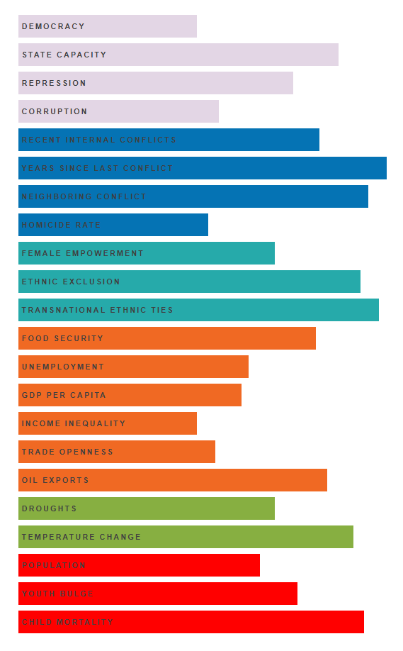 Building on previous work by the European Commission’s Joint Research Centre (JRC), JRC in consultation with the European External Action Service (EEAS) elaborated a methodological framework that includes a variety of structural indicators. The main goal was to rethink the concept of ‘risk of conflict’ by clustering conflicts into certain dimensions, before determining in a second step a set of associated indicators that are said to contribute to the outbreak of violence.